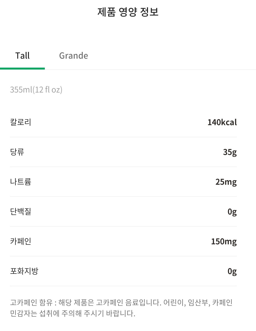 Tall 사이즈 기준으로 칼로리는 140kcal이고 카페인은 150mg입니다.우리나라 기준으로 하루 카페인 최대 섭취량은 400mg 이라 라임 패션 티 한잔이 꽤 고카페인이라는 걸 알 수 있습니다.