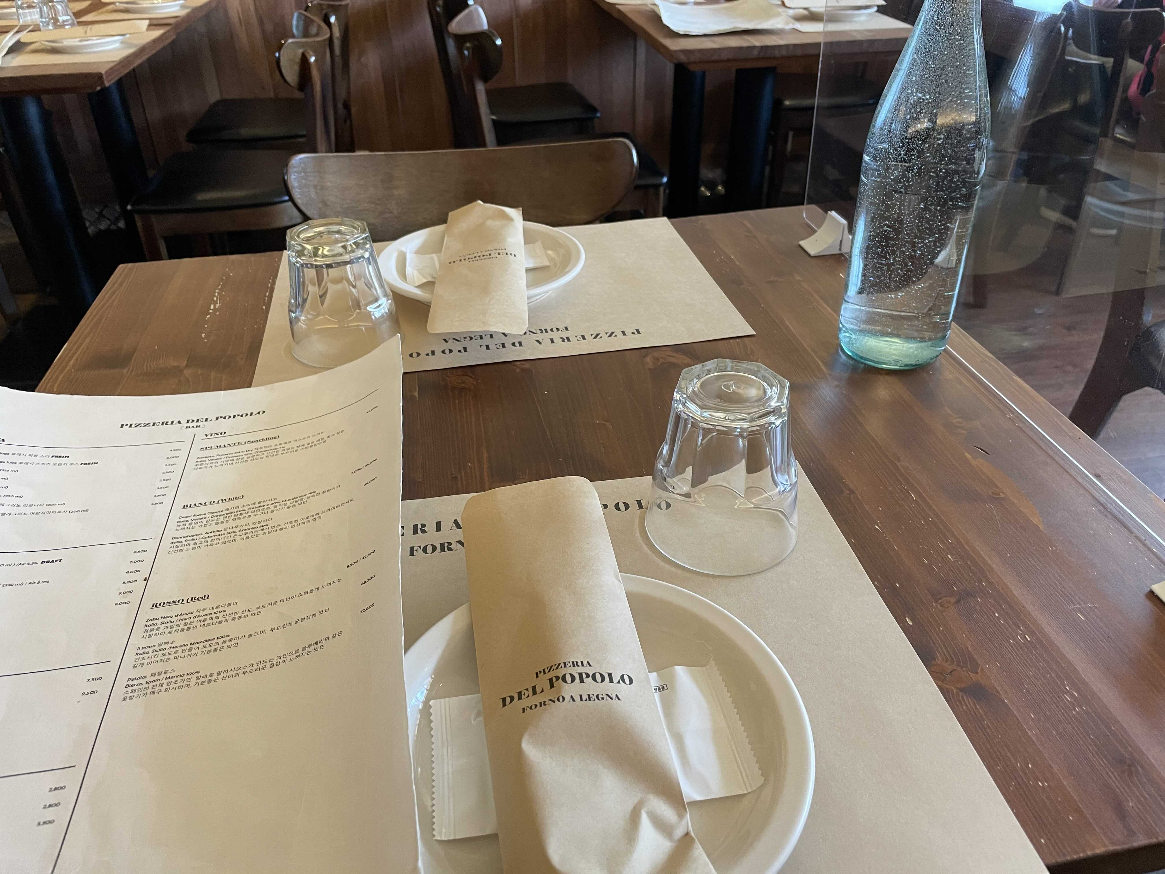 기본 셋팅 상태의 태이블 모습입니다. 나무테이블에 화이트한 매뉴판과 접시 그리고 유리물병과 잔이 놓여있는데요 모던한 느낌도 난다고 생각되었지요.
