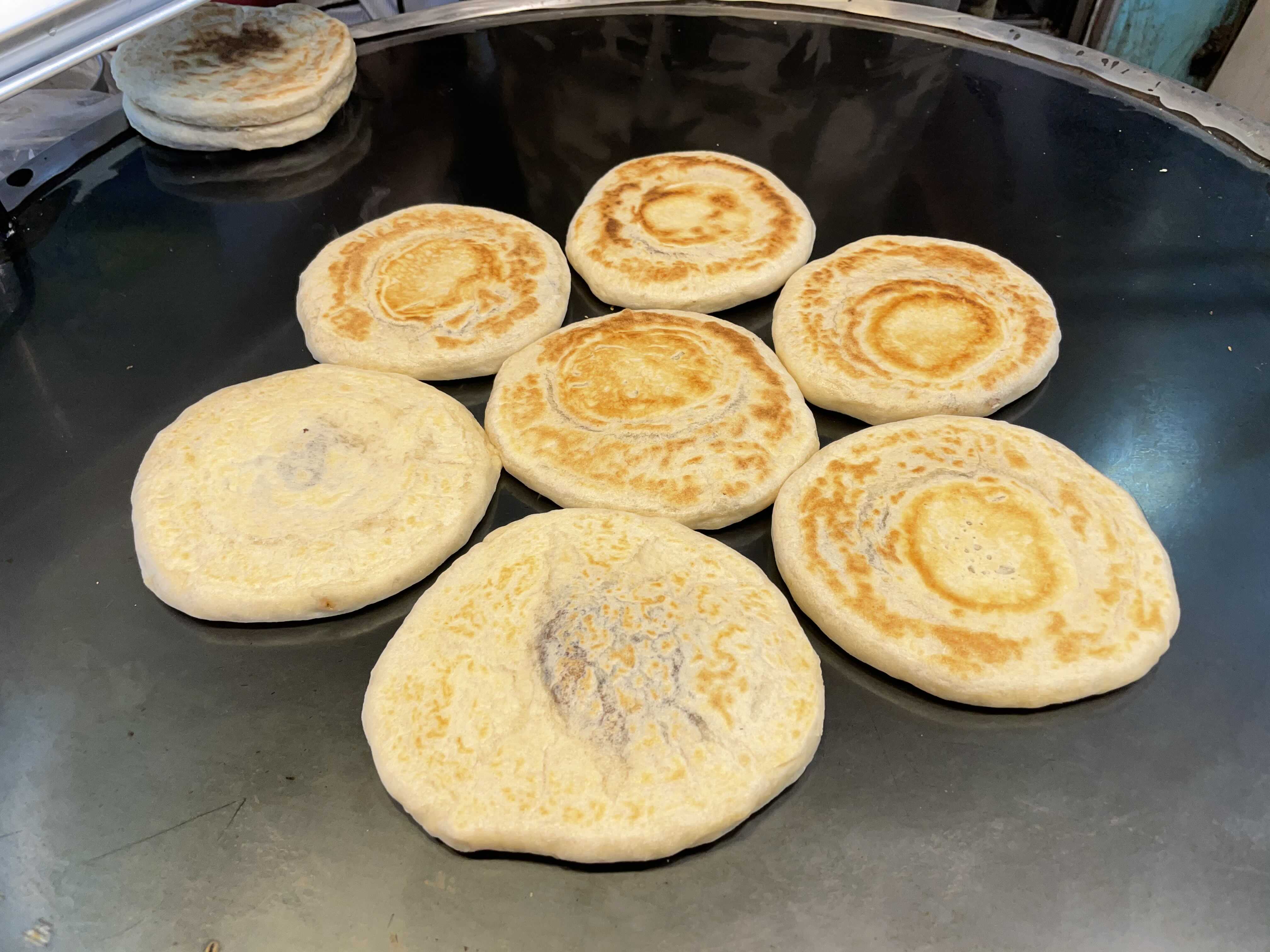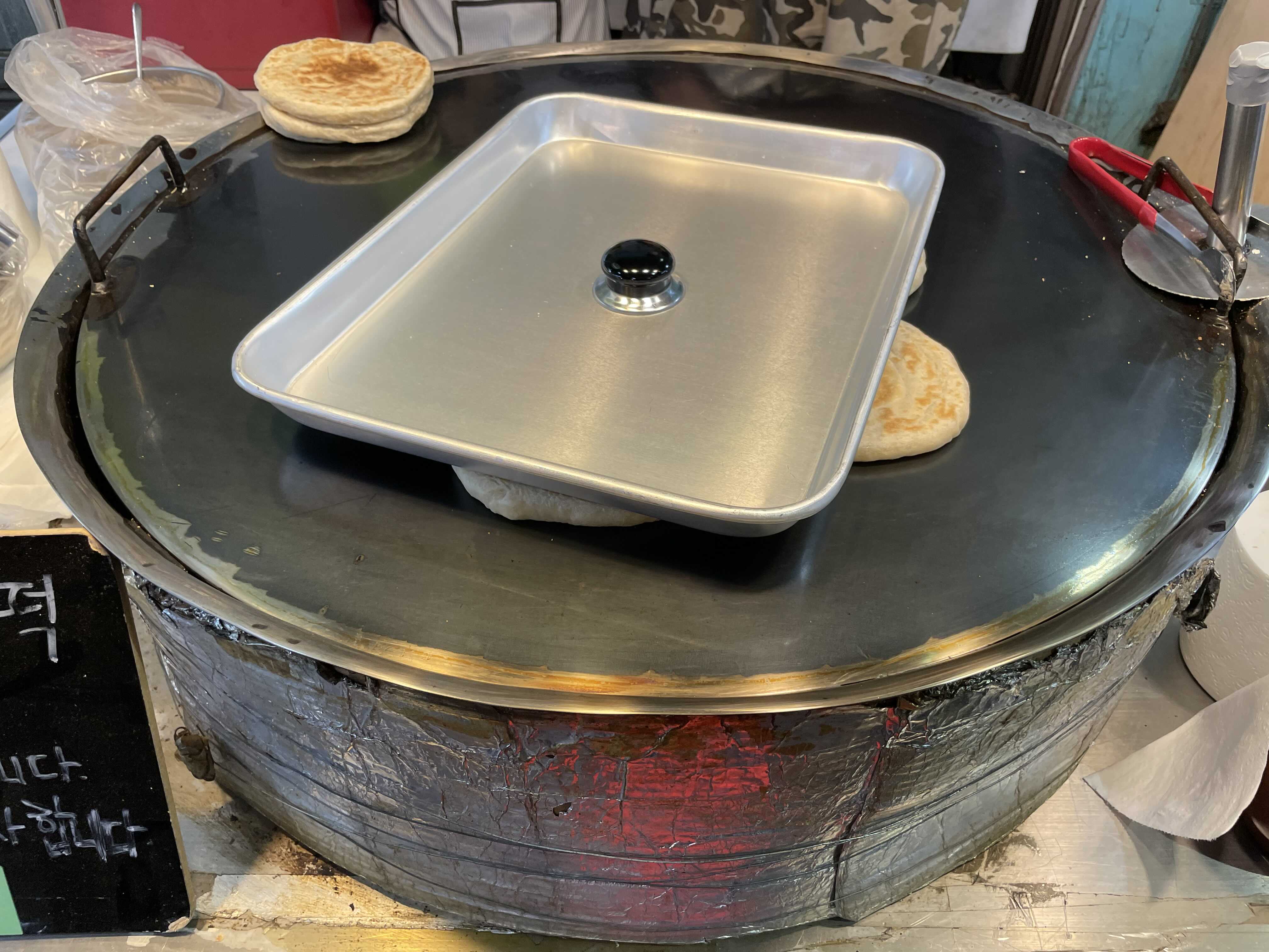 넓은 판에 구워지고 있는 호떡의 모습입니다. 보통 구운 호떡은 중국 호떡, 공갈호떡이라고 해서 기름기 없이 담백하지만 식감은 바삭한 호떡인데요.