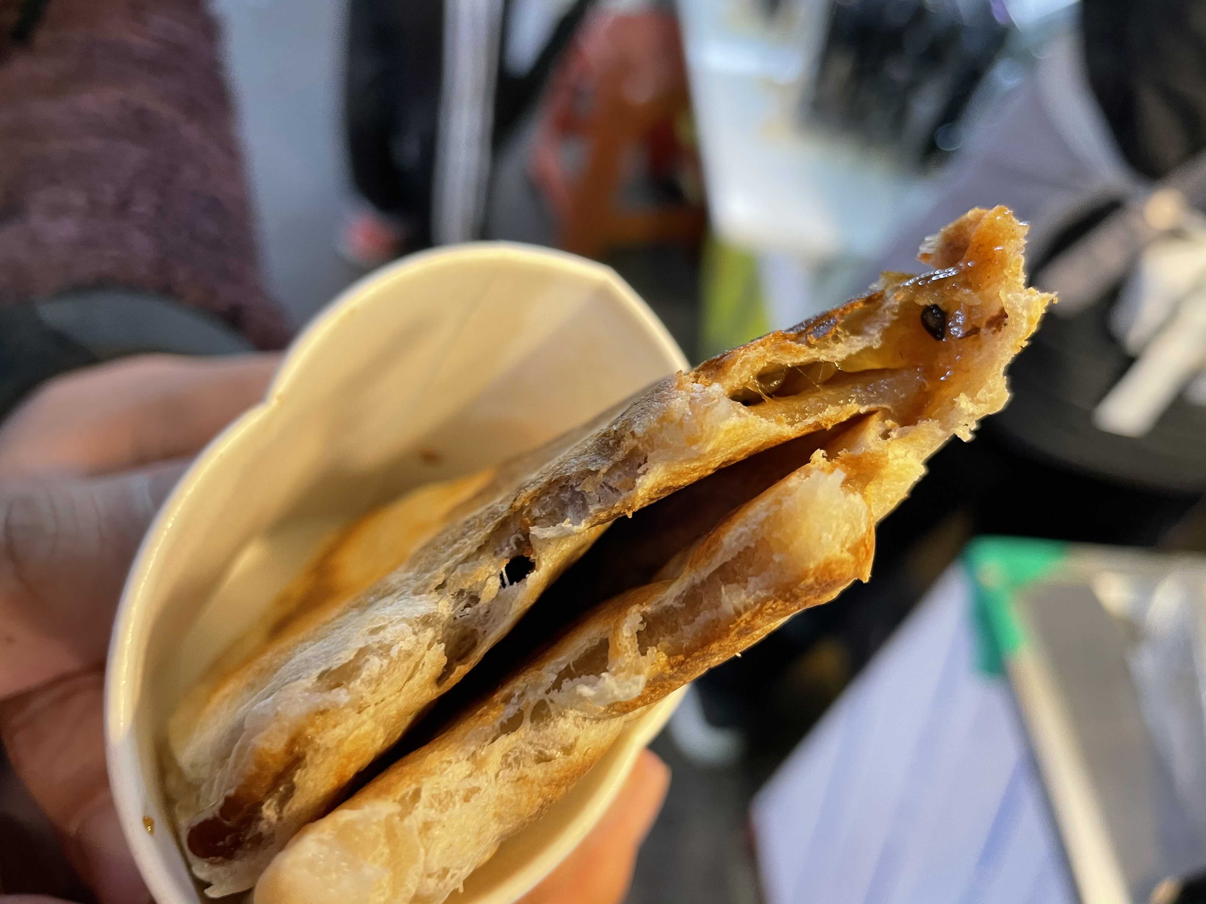 앞에 과정을 거쳐 완성된 호떡을 종이컵에 담아주셨습니다. 구워진 반죽 모습이 화덕에서 잘 구운 파스타 같았어요.