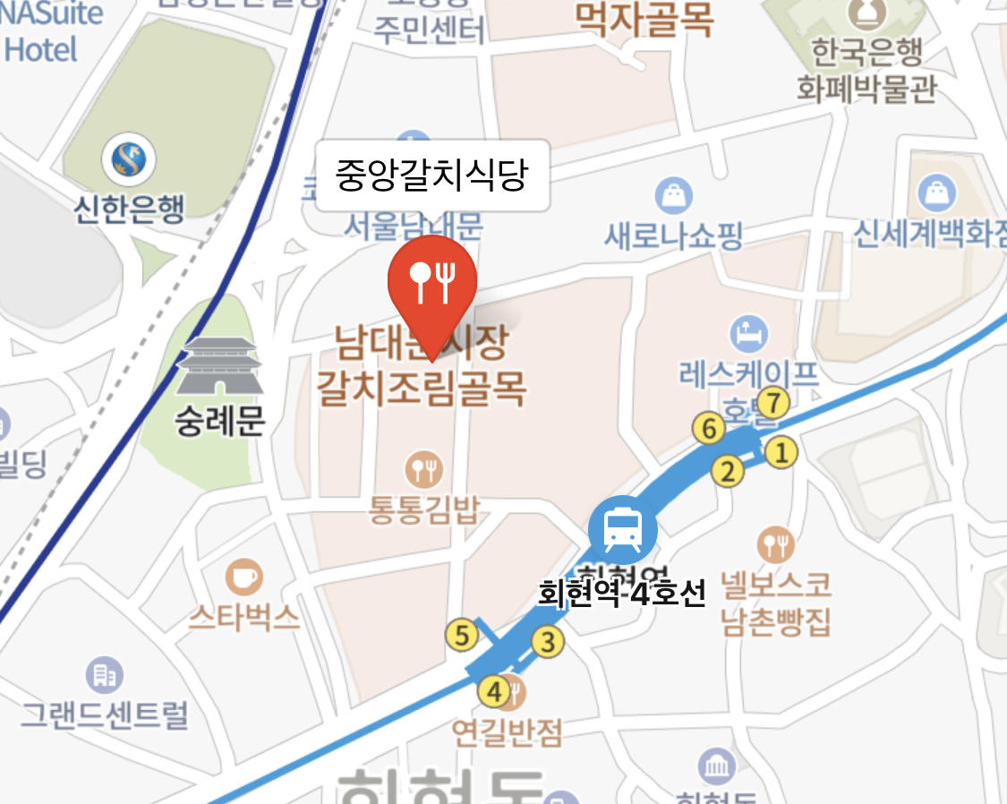 남대문 중앙식당은 4호선 회현역 5번 출구에서 찾아가시는게 가까우며, 1호선 서울역 부근 숭례문(남대문)근처에서도 금방 찾아가실 수 있습니다.
