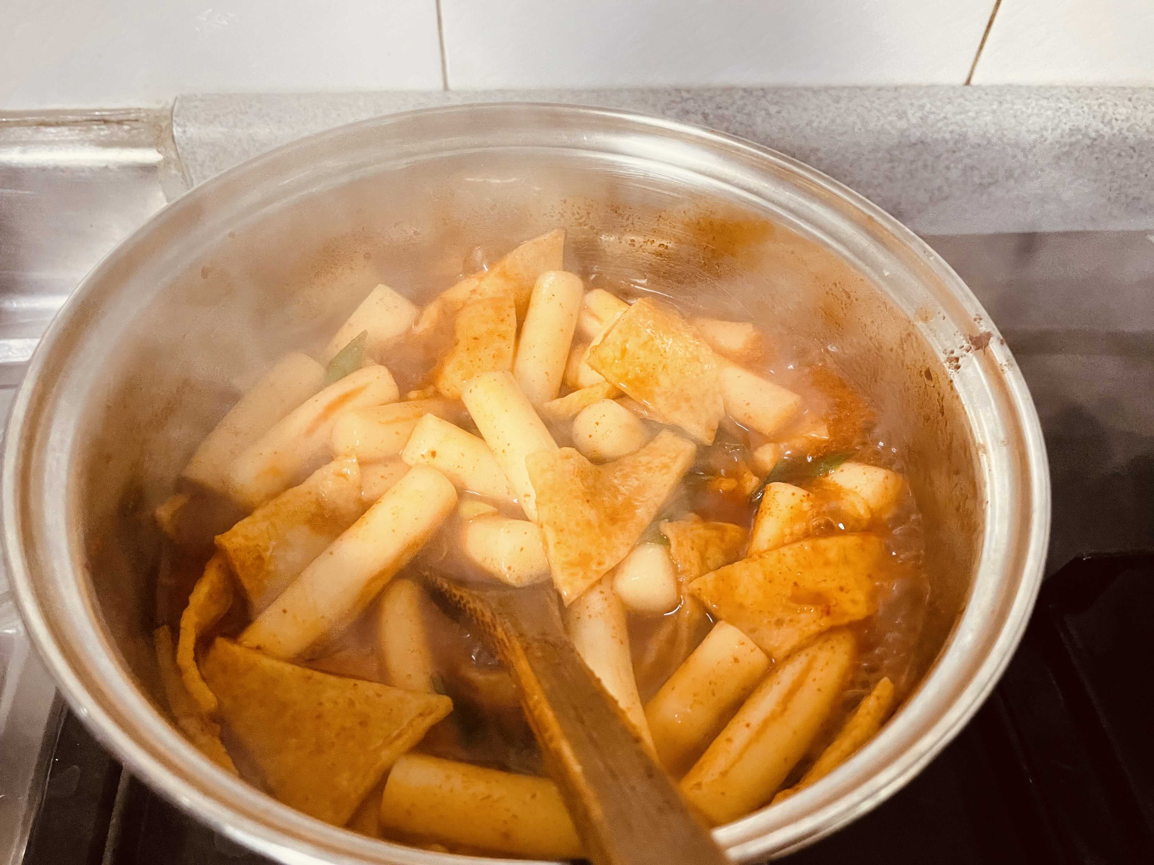 분말소스를 넣은 후에 더 보글보글 끓여주시면 됩니다. 양념이 밀떡에 쏙 간이 되도록 끓여주시면 좋아요!