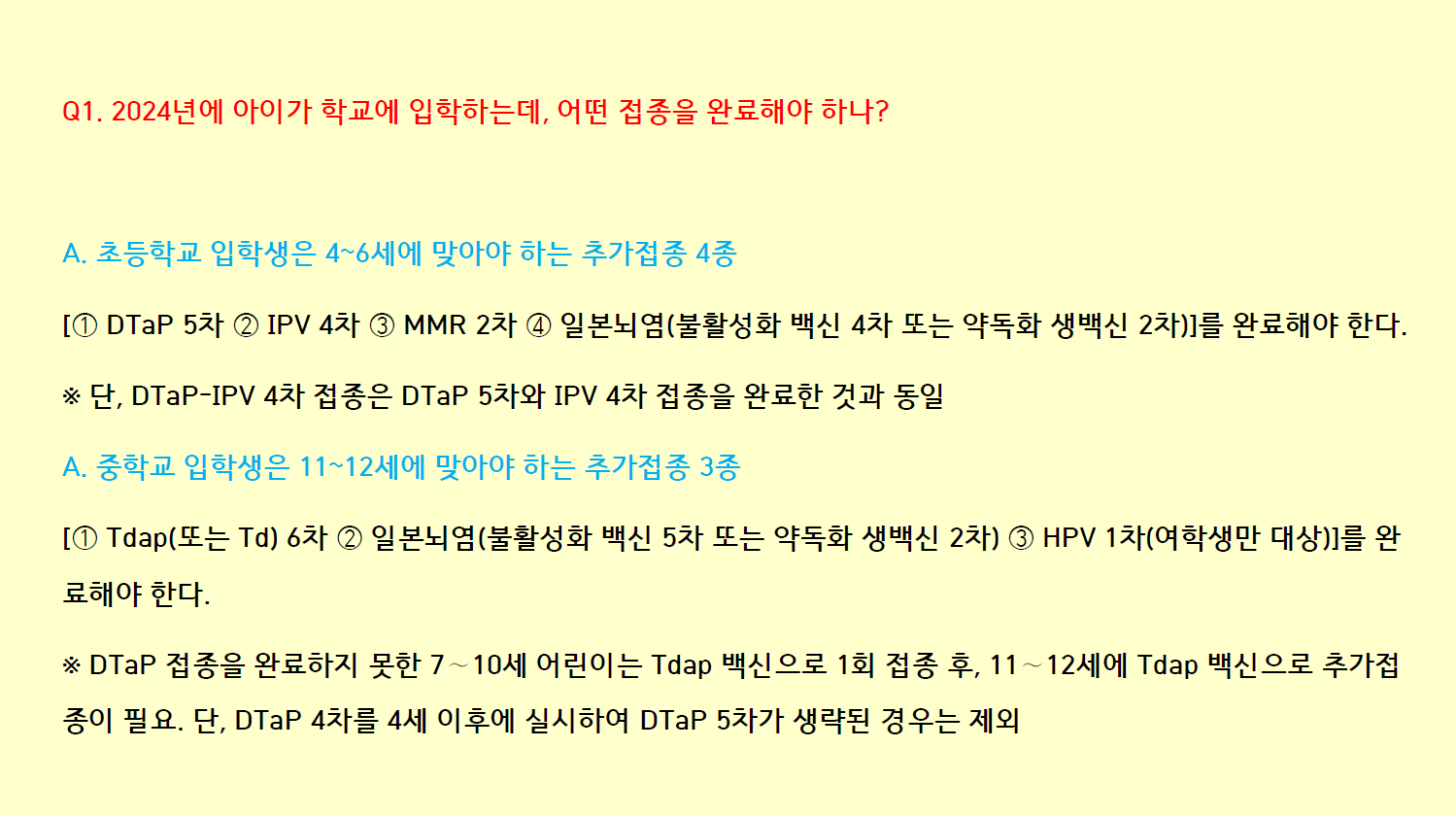 2024년 초·중학교 입학생을 둔 보호자분들은 학교 입학 전 어떤 예방 접종을 하셔야 하는지 확인을 하시고, 미접종 된 예방접종이 있다면 가까운 의료기관에 방문하셔서 확인하시면 좋겠습니다. 초등학교 입학생과 중학교 입학생별로 추가접종 해야할 예방접종 종류에 대해서는 상단 내용을 확인하시면 됩니다.